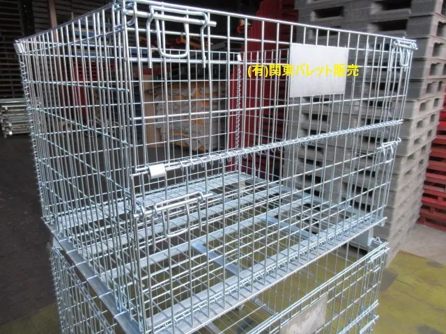 詳細中古メッシュパレット1回使用物です。鉄筋径約5mm/新品時800kg網目50×100(上部とヒンジ列は50×50)軽量タイプ・ユニクロ電気メッキ・ネームプレート付き。